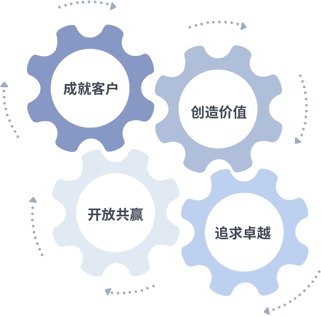 成就客户是一切决策的出发点,创造价值是衡量所有工作的标准,追求卓越是j6国际做事做人的态度,开放共赢是j6国际的格局也是最终的结果。价值观的齿轮环环相扣,推动着组织里的每个人不断向前。